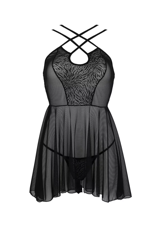 Die Spitze der Nude ist in einer schönen Spitze mit charmanten, zersplitterten Motiven gekleidet. Seine doppelkreuzigen Gurte auf dem décolleté bestätigen seinen trendigen Stil und ermöglichen eine schöne Brustretention.