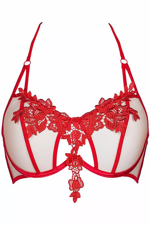 Balkon BH in transparenten beige Tüll, mit schönen roten Stickerei Stil Guipure, mit Riemen hinter dem Hals gebunden.