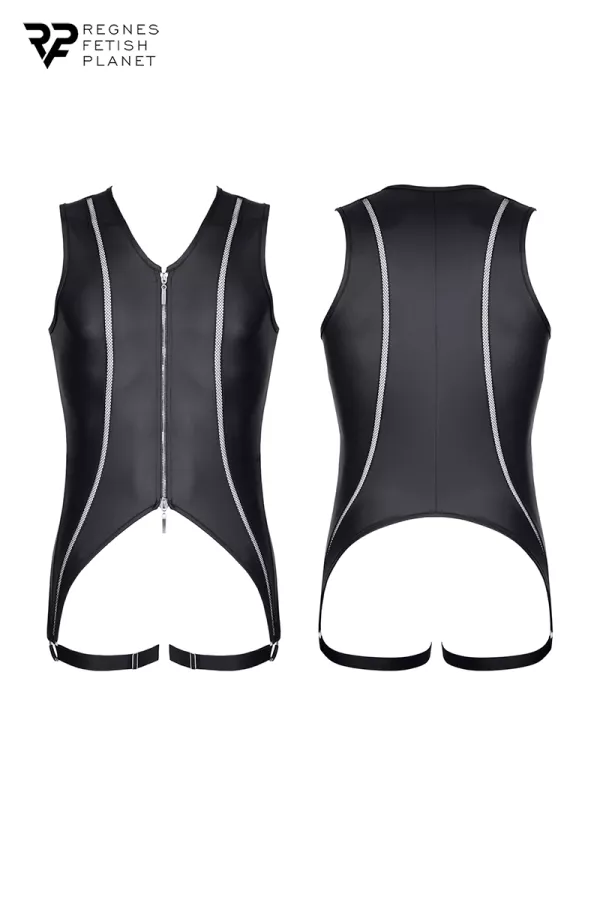 Der V Hals, kurze Ärmel und der Boden dieses Körpers sind verstärkt für mehr Festigkeit. Zwei elastische Bänder werden auf der Oberschenkelebene platziert, um den Stoff perfekt zu halten, sie sind einstellbar.