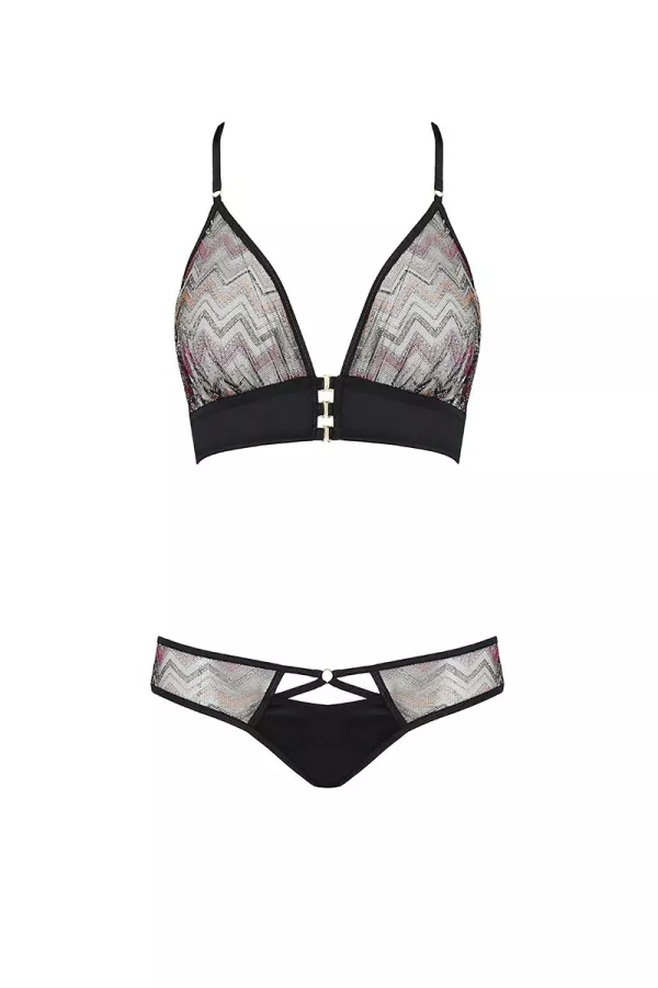 Die Oberseite ist ein BH mit Dreieck Hüte, die Brüste gut wickelt, ohne sie gezwungen, so bietet eine natürliche Erscheinung der Brust. Vorne von drei goldenen Gleitbändern geschlossen, hat der BH zwei verstellbare Riemen, die in einem eleganten und originellen Tülldreieck in der Rückseite fortfahren.