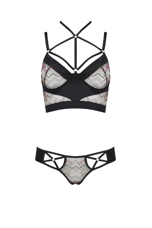 Schön geschnitten und reich an Details und Fantasien, das Set ist eine Harmonie von schwarzem Mesh mit satinierten Reflexionen, und Tüll bestickt mit farbigen Chevron-Muster, durch einen goldenen Faden betont.