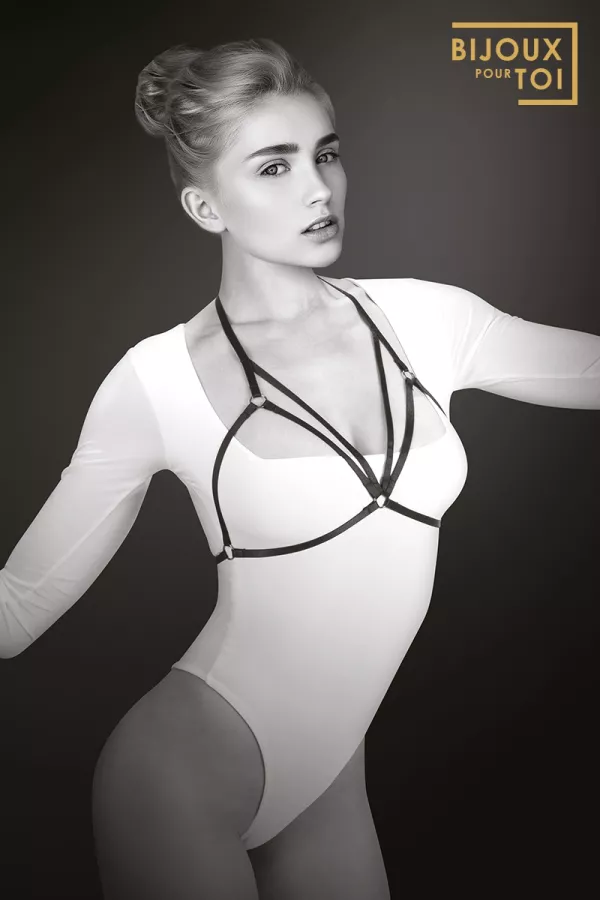 Der Morgane Body Harness ist aus schwarzen weichen und elastischen Riemen. Er passt sich dank einer Gleitschelle leicht hinten an.