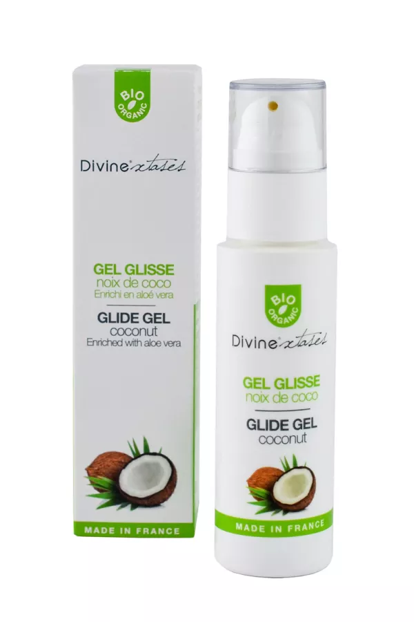 Coco Schlupfgel ist ein intimes Gleitmittel mit Kokosnuss, essbar, 100% organisch, hergestellt in Frankreich von Divinextases.