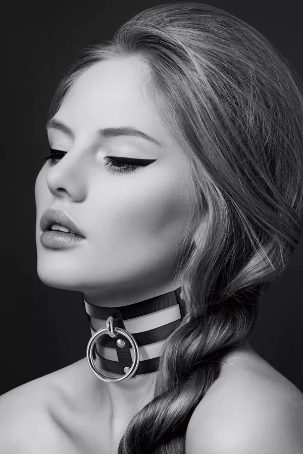 Eine breite Fetisch Halskette mit einem raffinierten Look sowohl chic als auch sexy, entworfen in schwarzem Leder Simili, mit einem Metallring auf der Vorderseite, um eine Leine oder ein Bondageseil zu befestigen.