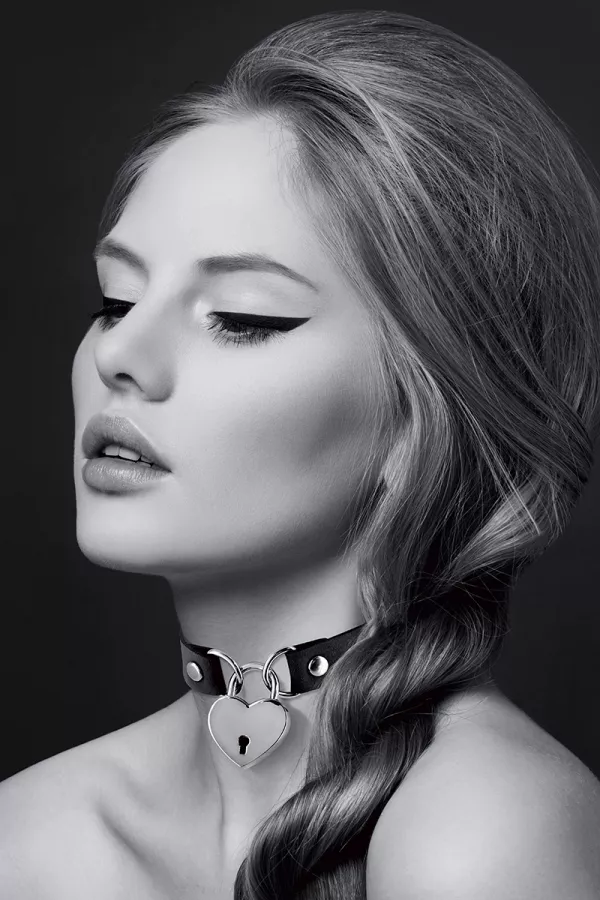 Ein verstellbarer Kragen mit sexy und fetisch aussehen, in schwarzem Ledersimili, mit einem silbernen Cur als Anhänger.