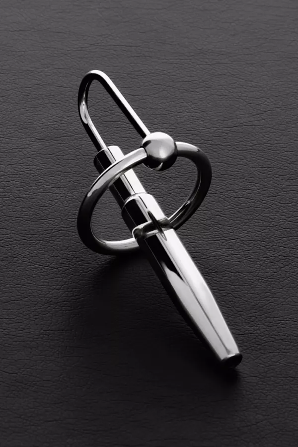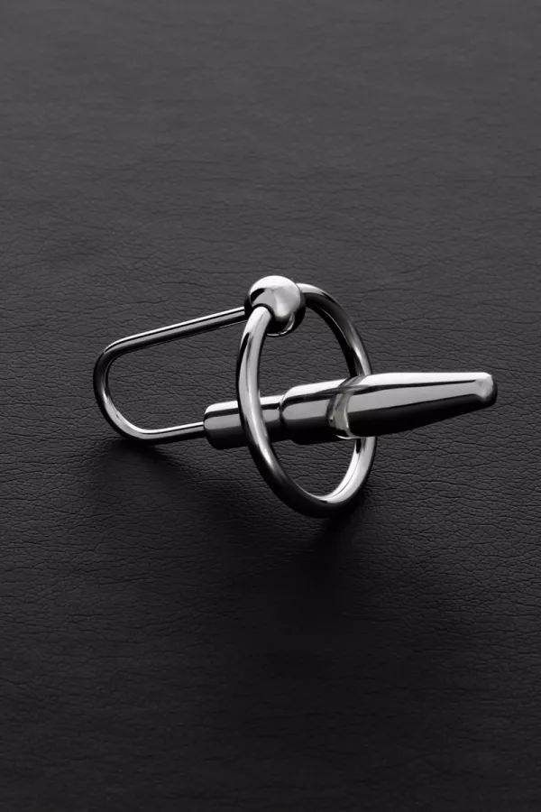 Aus hochwertigem Edelstahl mit poliertem Finish besteht der Penissteckerring aus einem abnehmbaren Ring, an dem ein kleiner Harnröhrenstecker in Form von "Mini Fucker" befestigt ist.