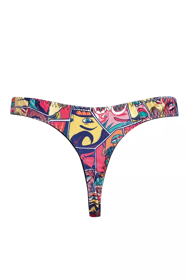 Dieser sexy String ist aus Stoff gedruckt mit Gesichtern inspiriert von Comics und Pop-Art.