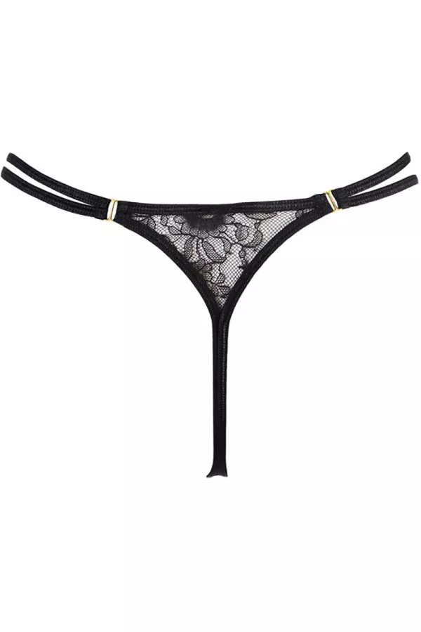 An der Vorderseite hat die zarte Spitze eine vertikale Öffnung, die von kleinen elastischen Bändern gehalten wird, die mit einem kleinen goldenen Schmuck ähnlich wie ein bree verziert sind.