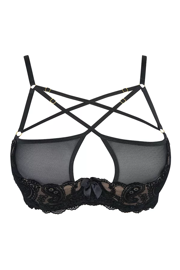 This bra plays with the transparency but also with the lines thanks to its adjustable straps that divide in 3 to the front and cross over the top of the chest. Back closure by 3-position staples.