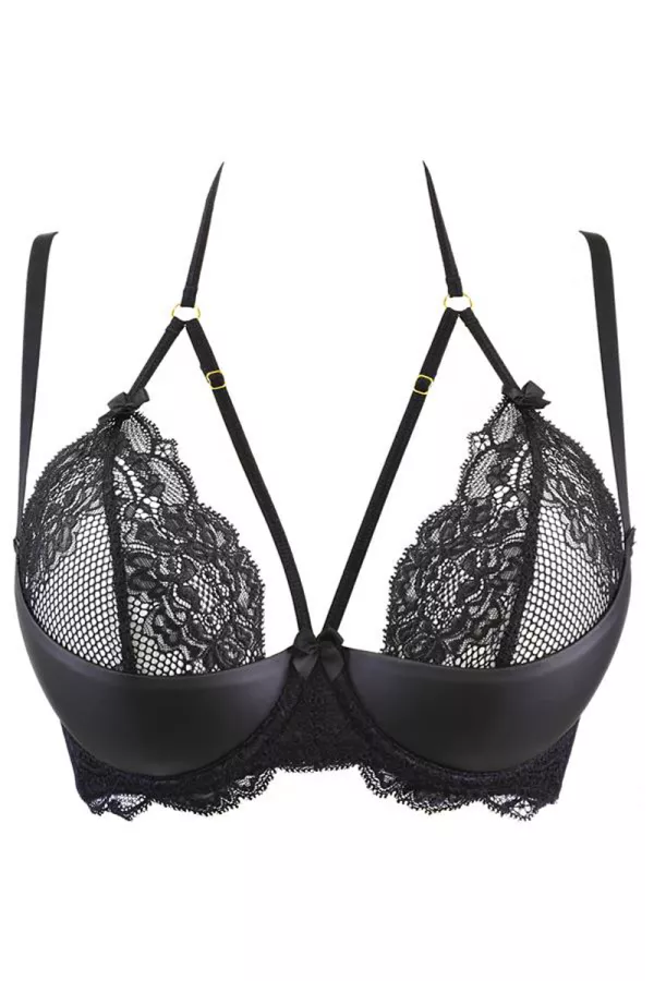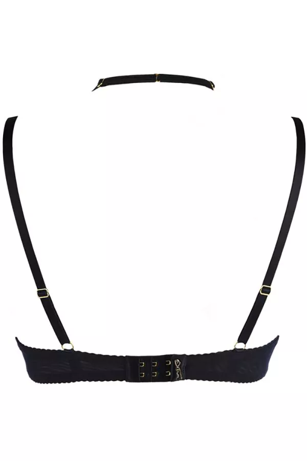 A double strap that turns the neck takes place on the top of the breasts, it complements their enhancement with perfection. The setting elements are made of gold metal and the bra is decorated with 3 knots in satin.