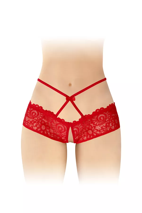 The open panties Célia rouge is incredibly naughty with its cut "very" low, its front opening back and its crossed straps that emphasize the nudity of the lower belly and top of the buttocks.