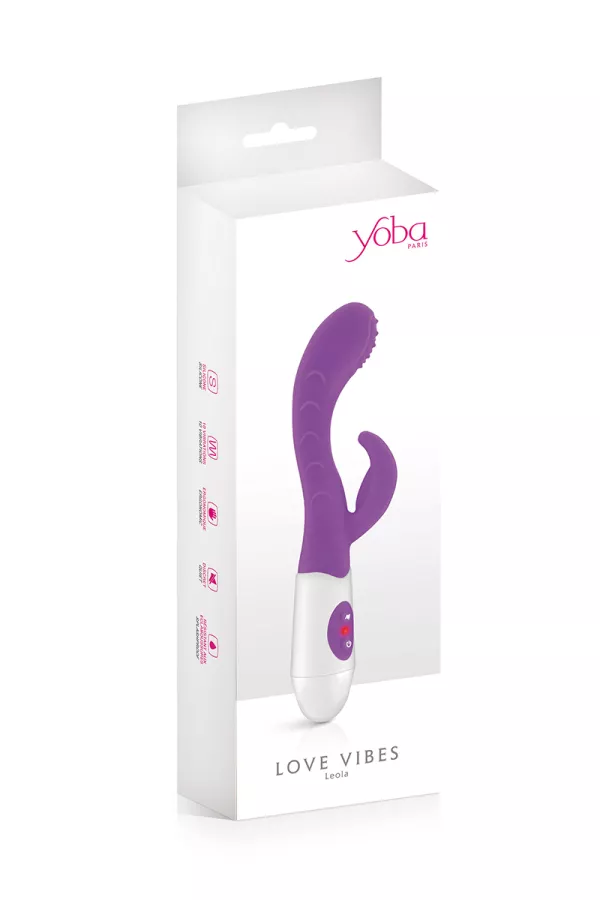 The vibrator Rabbit Leola (purple colour) of the brand Yoba is a quality sex toy dedicated to feminine pleasure. At the same time, it stimulates the vagina, especially the area of the G-point thanks to its curved shape and its head with rounded head with pins, and the clitoris thanks to its small, stimulating ergot carefully placed.