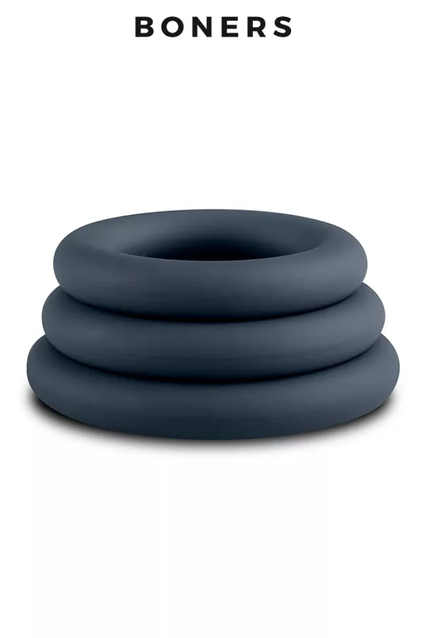 The brand Boners presents the "Cock ring set", a set of 3 classic cockrings of different diameters at the same time soft, stretchable and comfortable to wear, thanks to their extra soft silicone material.