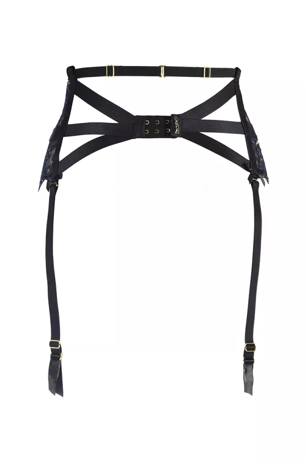 Structuring by stems that ensure a beautiful outfit on the waist, the belt is composed of a light black lace with blue and golden patterns and, decorated in the middle of a black elastic and small satin nodes above the removable suspenders.