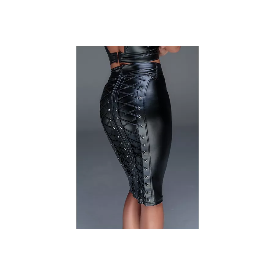 Closed behind by a full zip on the entire length of the skirt, it sublimates the buttocks and thighs with two laced inserts that descend to the bottom of the skirt.