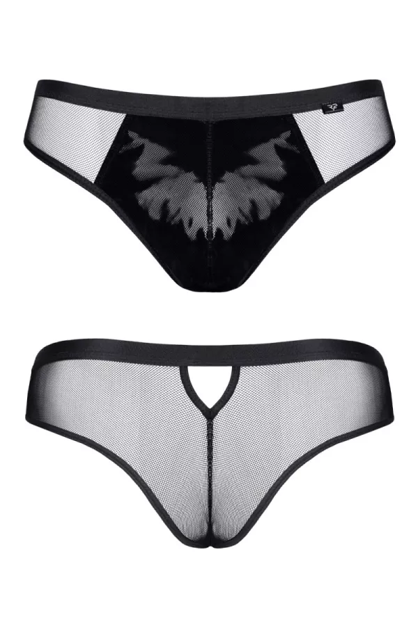 The brand Regnes Fetish Planet offers you to discover this Brazilian brief made of extensible black tulle that plays with transparency. At the sex level it is doubled with a brilliant black vinyl to attract the eye without showing everything. This sexy brief is held firmly in place by a wide elastic band that serves as a belt.