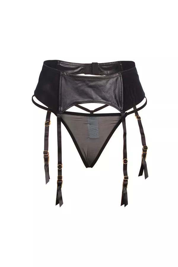 Black garter belt in wetlook with brand thong Paris Hollywood.