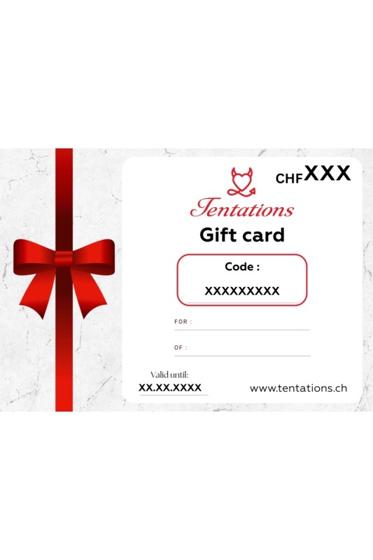 Le cadeau zéro stress : tu offres le plaisir, l’autre choisit l’envie. Valable sur tout l’assortiment Tentations, disponible en CHF 50.–, 100.– et 200.–, en 4 langues. Envoi discret en courrier A sous 1 à 2 jours ouvrables ou par email sur demande.