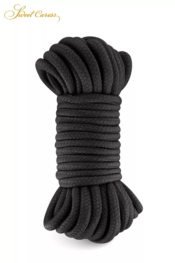 Corde de bondage en coton noir, longueur 10 mètres, pour la pratique des jeux BDSM et du shibari, par Sweet Caress.