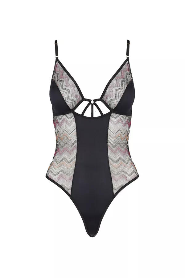 Joliment coupé et riche de détails et de fantaisies, le body est une harmonie de maille noire aux reflets satinés, et de tulle brodé de motifs colorés en chevrons, soulignés par un fil doré.