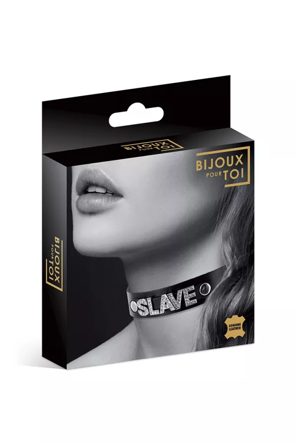 Avec le mot "SLAVE" en bijou strass en relief sur le devant, ce collier noir, ras de cou, de la marque Bijoux pour toi, affichera clairement votre côté soumise et coquine.