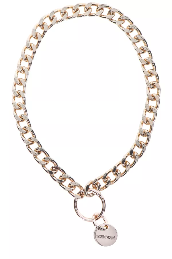 Le collier est composé d'une chaine en métal doré rose brillant et d'un médaillon avec la marque Taboom gravée dessus.
