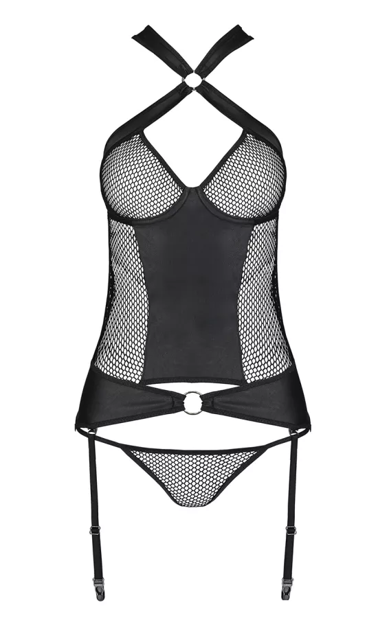 Structurée sur un patron en faux cuir mat fin et souple, la guêpière en résille ajourée, met admirablement en valeur la poitrine avec ses bonnets à balconnets et le décolleté en losange qui s'ouvre sur le sillon des seins. Les bandes de faux cuir recentrent la poitrine pour lui donner encore plus de volume, et s'articulent sur deux anneaux chromés qui se terminent par des bretelles ajustables. Elle est fermée dans le dos par une longue bande à agrafes réglable sur deux positions.