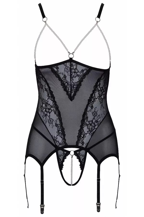Le corps de la guêpière en fine résille et dentelle extensibles, possède une fermeture à agrafes dans le dos réglable sur deux positions. Quatre bretelles réglables permettent de fixer vos bas (non fournis). Les seins nus sont soulignés par des rangées de perles qui cerclent les seins joliment mis en valeur.