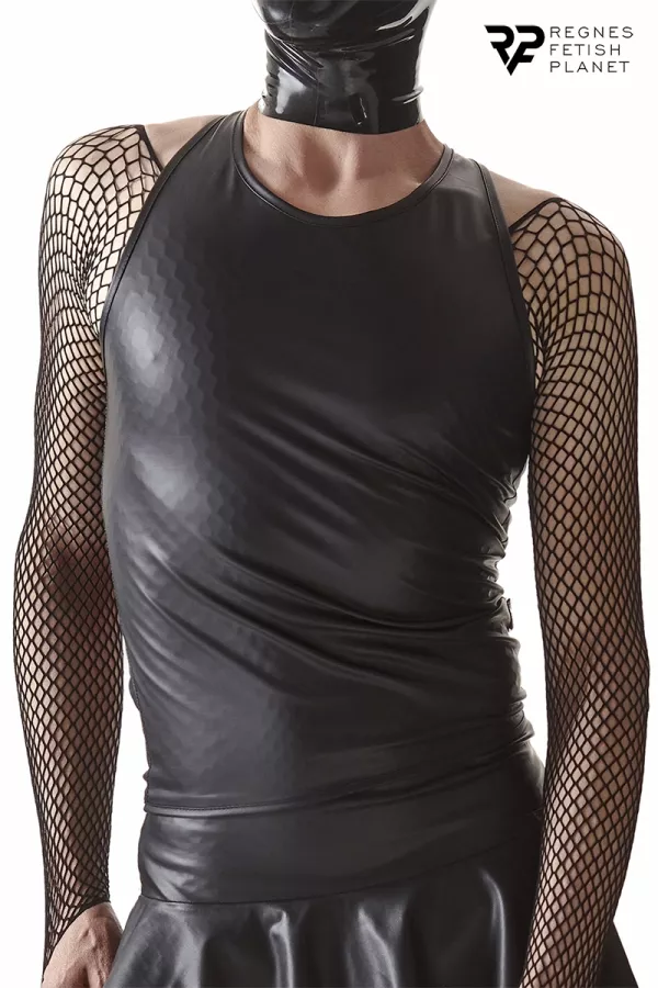 Débardeur noir en wetlook extensible, pour s’adapter parfaitement à la morphologie de chacun. La marque Européenne Regnes Fetish Planet a créé une collection dédiée aux hommes voulant explorer de nouvelles visions deux-mêmes, et a tout naturellement pensé ce modèle classique devant et totalement original dans le dos.