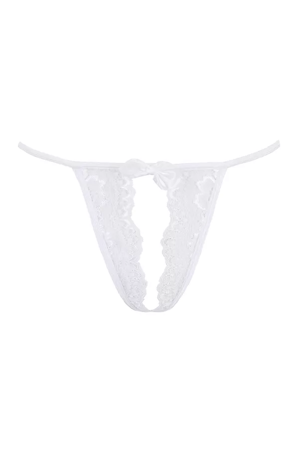 Osez la sensualité irrésistible de ce string fendu blanc immaculé en dentelle, décoré d'un noeud satin sur la ceinture.