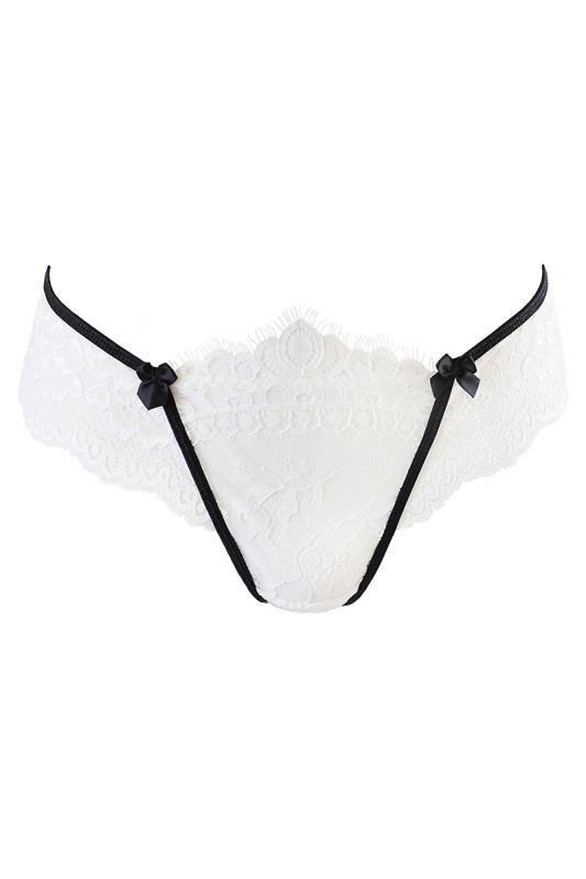 Délicate composition de deux dentelles blanches soulignée d'un fin élastique noir, ce string sensuel Axami est une lingerie féminine au charme savoureux.