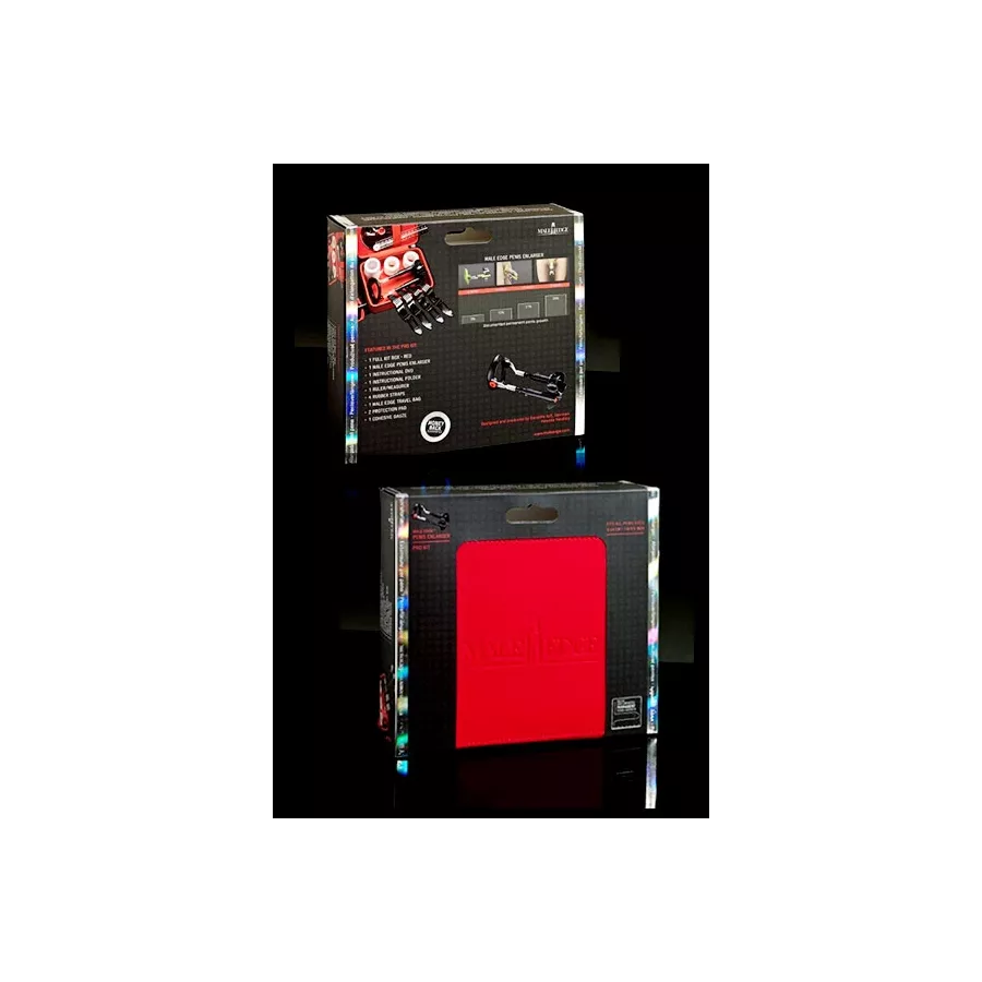 Emballé dans un étui rouge et noir de qualité supérieure et présenté dans une élégante boîte cadeau rouge, MaleEdge Pro est livré avec quatre sangles en caoutchouc, deux patins de rechange, un sac de Voyage et de la gaze cohésive. le tout est accompagné du dvd pédagogique du programme officiel MaleEdge.