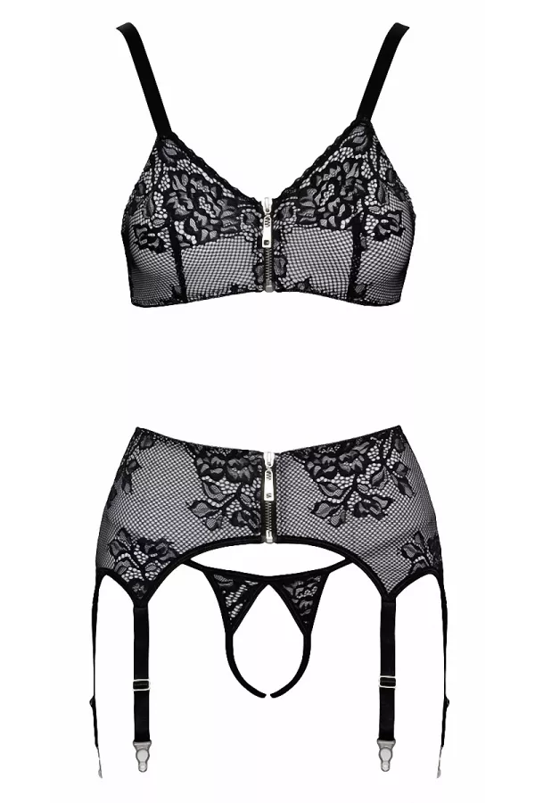 Cet ensemble coquin Cottelli Lingerie est composé d'un soutien-gorge et d'un porte-jarretelles fermés devant par un zip chromé et des attaches à agrafes derrière. Le string vertigineusement ouvert et totalement assorti complète l'ensemble.