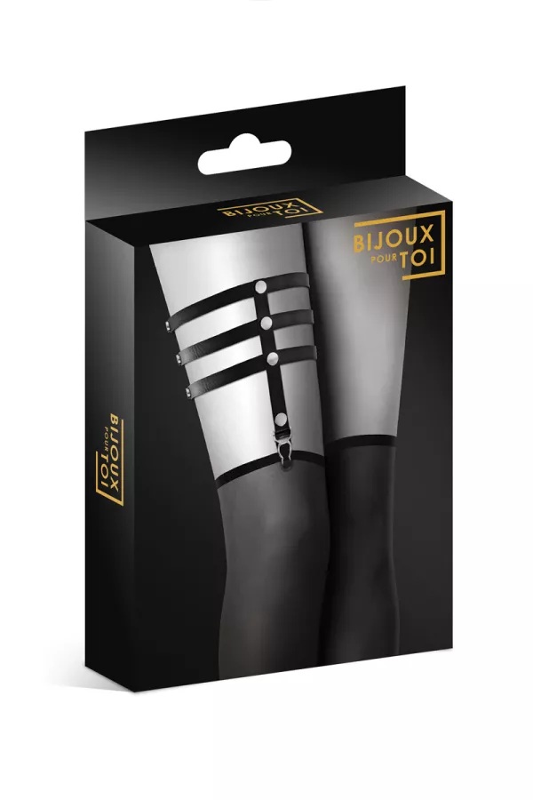 La marque Bijoux pour toi présente cette magnifique jarretière noire réglable de type fétichiste, avec 3 lanières en simili cuir et des rivets en métal.