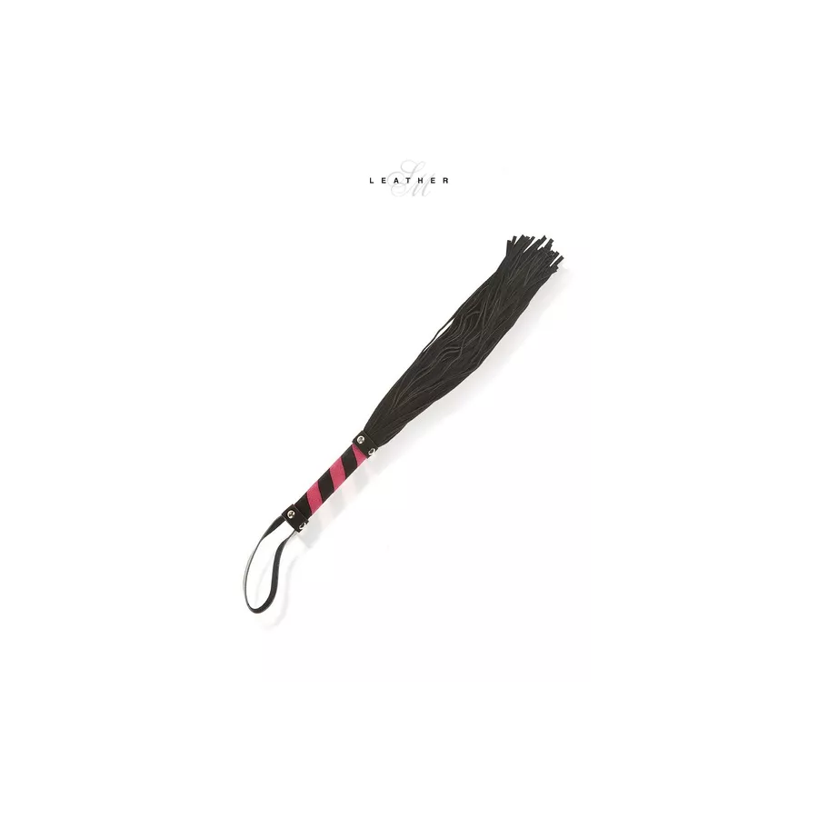 Martinet en cuir (daim) de la marque Leather SM avec 44 lanières extra douces et une poignée rigide bicolore noire et fuchsia.