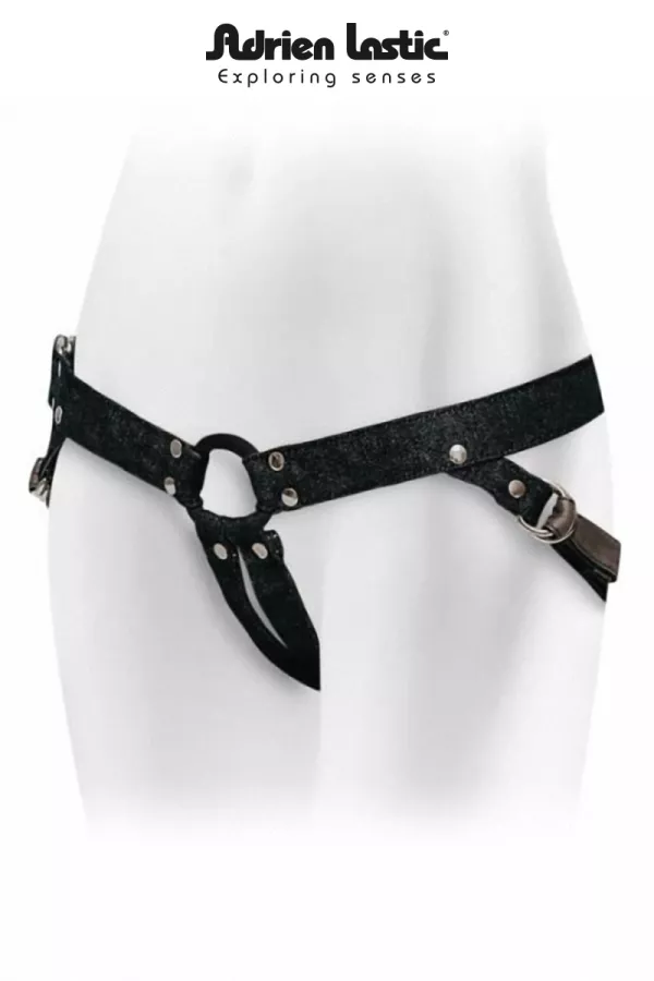 Le Harnais porte gode Lastic Strap-on est fabriqué à la main en jean noir.
