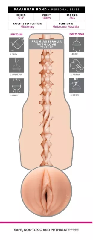 Charme sensuel, formes irrésistibles, accent australien inimitable… Savannah Bond s’invite dans ton lit avec ce Fleshlight moulé directement sur son anatomie intime. Ce modèle officiel de la collection Fleshlight Girls te propose une expérience réaliste, intime et intensément stimulante, fidèle à l’aura magnétique de la star.