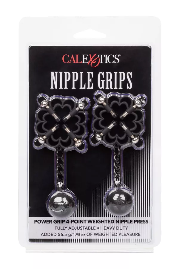 Repoussez les limites du plaisir avec les pinces lestées pour tétons (ou clitoris) "Nipple Grips 4-Point weighted Nipple Press" de la marque Calexotics.