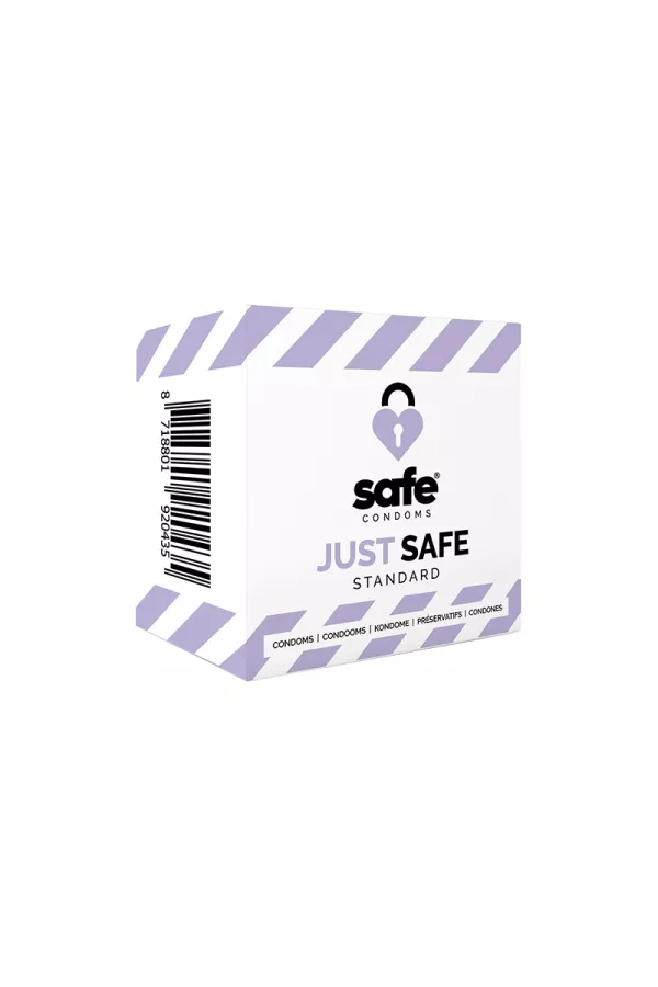 Just Safe est un préservatif standard au design anatomique qui convient à (presque) tout le monde (et pour les autres, voir les Préservatifs Safe XL).