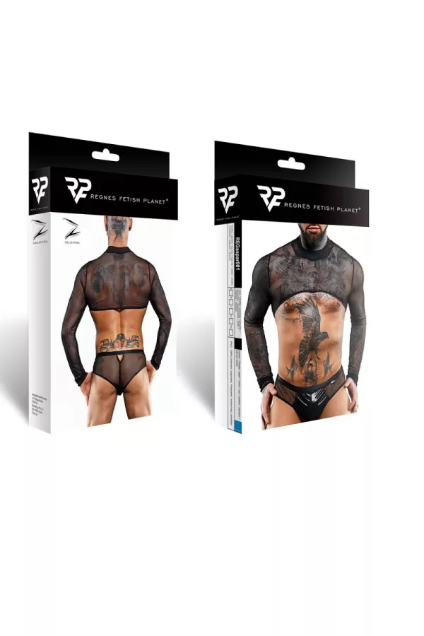 La marque Regnes Fetish Planet vous propose de découvrir ce crop top fabriqué entièrement en tulle noir extensible. La découpe originale de ce top pour homme élargit les épaules et la poitrine tout en laissant apparaître le dos et le torse.