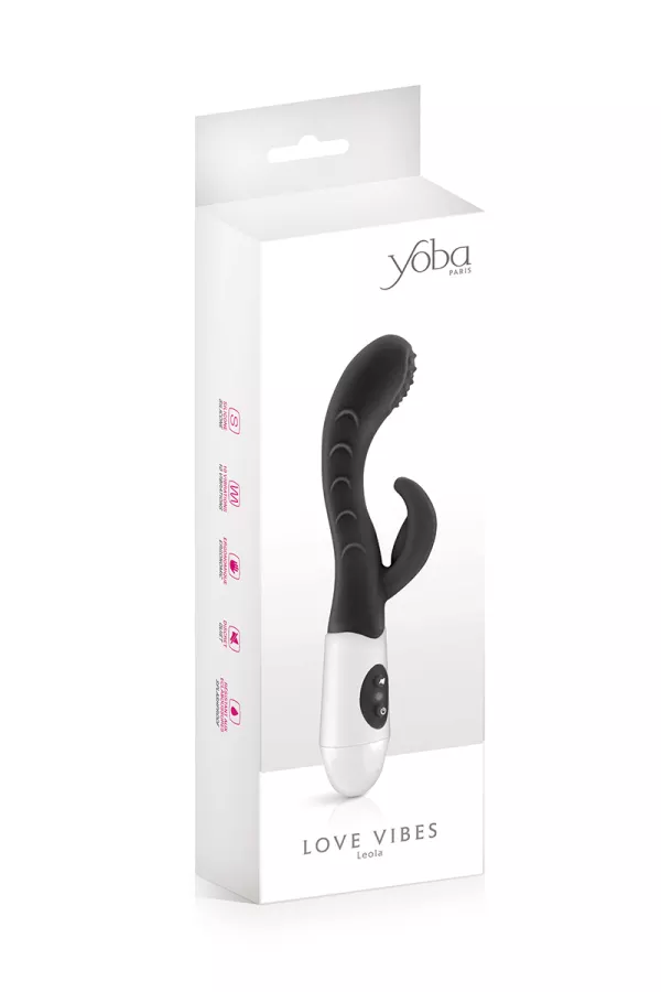 Le vibromasseur Rabbit Leola (coloris noir) de la marque Yoba est un sextoy de qualité dédié au plaisir féminin. Il stimule en même temps le vagin, tout particulièrement la zone du point G grâce à sa forme incurvée et sa tête avec tête arrondie dotée de picots, et le clitoris grâce à son petit ergot stimulant judicieusement placé.