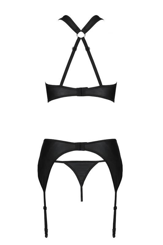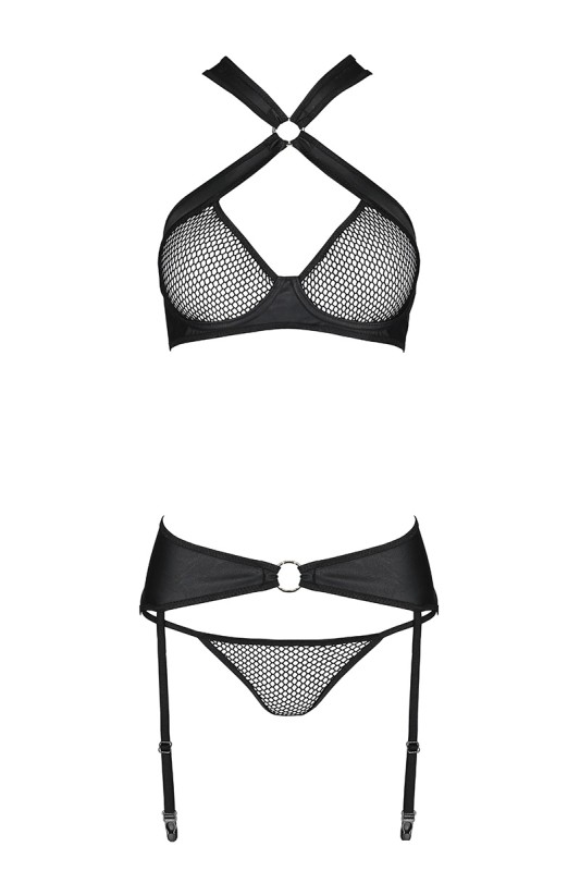 Il taglio molto trendy di questo set, conferma il suo lato seducente e sofisticato con la qualità dei tessuti: un ecopelle opaco, fine ed elastico per la manutenzione e l'estetica; una rete trasparente con emozionanti mesh a traforo.