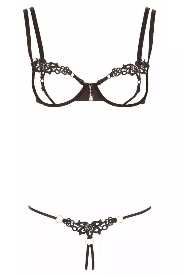 Questo set di lingerie erotiche è un piccolo gioiello di tentazione: un perizoma totalmente aperto, più un reggiseno con armature particolarmente denudate, uguale un irresistibile outfit libertino.