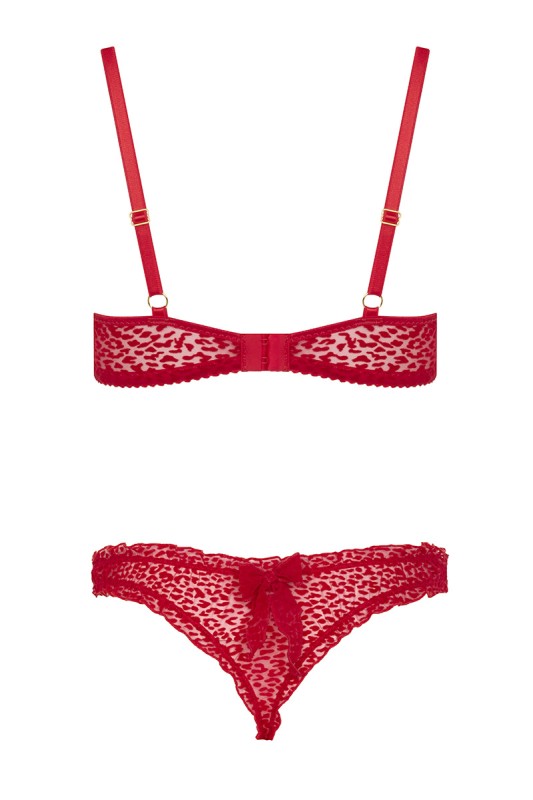 Il set 2 pezzi Catilla è composto da un reggiseno e un perizoma abbinato in tulle rosso flocculato con un motivo che potrebbe richiamare un bellissimo vestito felino.