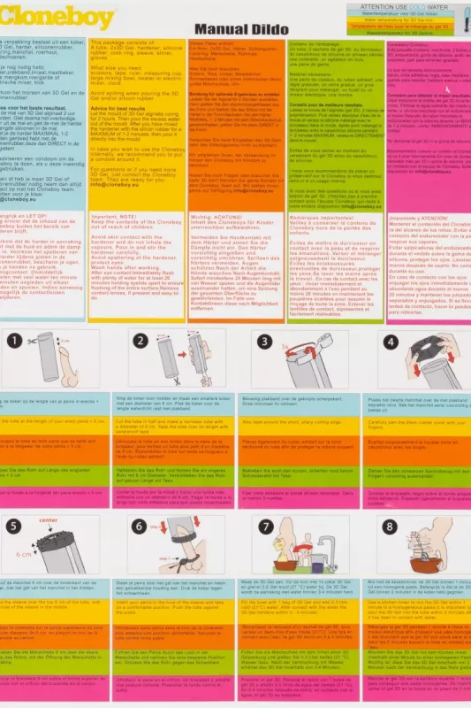 - Contenuto: 1 stampo (confezione), 1 bustina di gel 3D, 2 contenitori di silicone (A + B), 1 spatola in legno, 1 paio di guanti, 1 anello penieno, 1 manicotto con stimolazioni, 1 manuale multilingue.