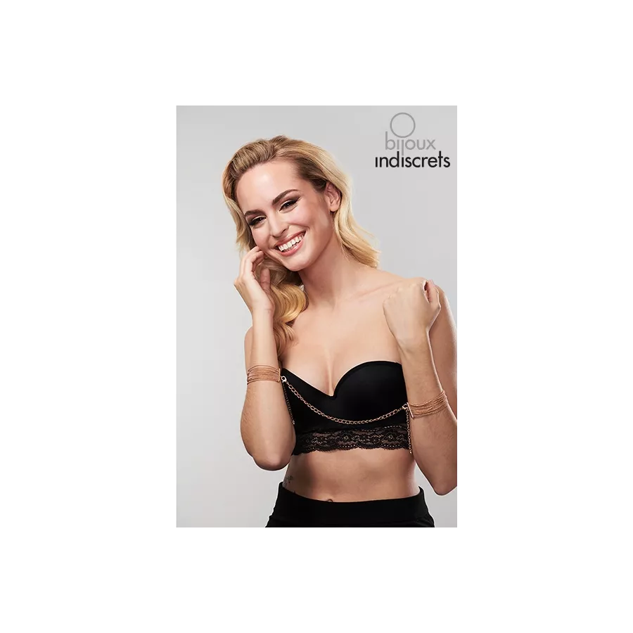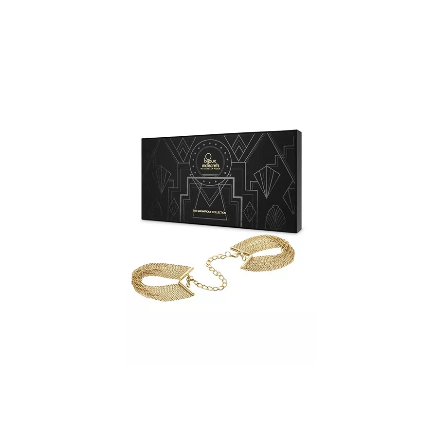 Il marchio Bijoux Indiscrets offre attraverso la sua collezione "Magnifico" un paio di bracciali regolabili / Menotte in catene metalliche placcate in oro.