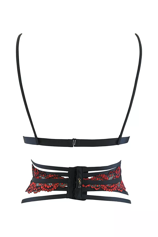 Dare una lingerie provocatoria e inventiva in pizzo nero e rosso, che sposa un reggiseno a triangolo delicato e una sontuosa serra.